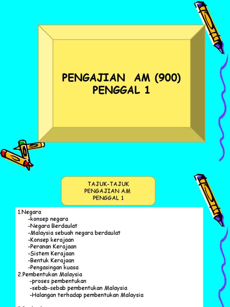 PENGAJIAN AM SEM 1 Gradelevel. Nota Ringkas Pengajian Am Penggal 1 siri 1 KONSEP NEGARA Konsep Negara ada sempadan ada sistem pemerintahan ada rakyatpemastautin tetap Sempadan negara yang beradaulat ada sempadan yang jelas sempadan membolehkan negara yang beradaulat ditadbir dengan sistematik sempadan menentukan bidangkuasa politikekonomi dan mobiliti sosial negara.